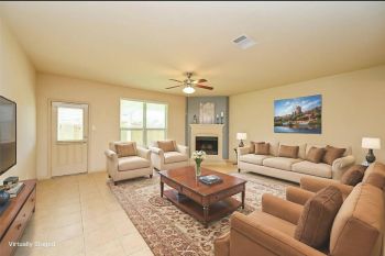 Very rare 1.5 story home w/main rooms/areas downstairs. Beautifully built 4 bedrooms, 3.5 bath home located in Shadow Creek Ranch master planned community. Upstairs layout w/its own thermostat is perfect for a multi-generational family, college student or in-law suite, complete w/ bedroom, walk-in closet, open living area & en-suite bath. Dramatic 13 ft. entry w/ tray ceilings and expansive dining area. Beautiful arches and cozy gas fireplace. Delightful chef's kitchen with granite counters, center island, breakfast bar, built-in desk, stainless appliances, gas stove and walk-in pantry. Split floorplan allows privacy with primary bedroom toward back of the home with dual sinks, garden tub and large walk-in closet. Two downstairs secondary bedrooms also have walk-in closets w/shared bathroom. Additional features include two water heaters, oversized covered patio, newly stained fence & 2.5 car garage. So many amenities here including pools, parks, lakes and more. Call today!